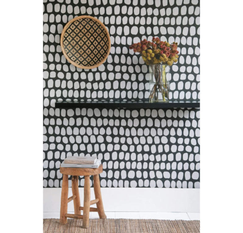 1. Este hall combina o papel de parede gráfico em preto e branco com artes indígenas da tribo tukano, do Amazonas. O décor se complementa e causa impacto!