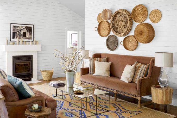 6/11 Buscando um estilo mais rústico, Bonnie e Hank, moradores de uma vinícola na Califórnia, chamaram a designer Laurie Furber para decorar sua sala de estar. No cômodo, o branco nas paredes facilita uma configuração mais ousada de cores, com tons terrosos predominantes. Os dois sofás possuem formas e materiais diferentes, no entanto, o veludo e o couro completam o visual vintage da sala. A mesinha de centro de espelho e linhas simples faz o contraste entre o antigo e o contemporâneo. O destaque são os cestos, garimpados por Bonnie em viagens pela Europa e pendurados em composição assimétrica. A sobreposição de tapetes combinando com as almofadas finaliza o décor com um aspecto de casa de campo. (Reprodução/Casa.com.br)