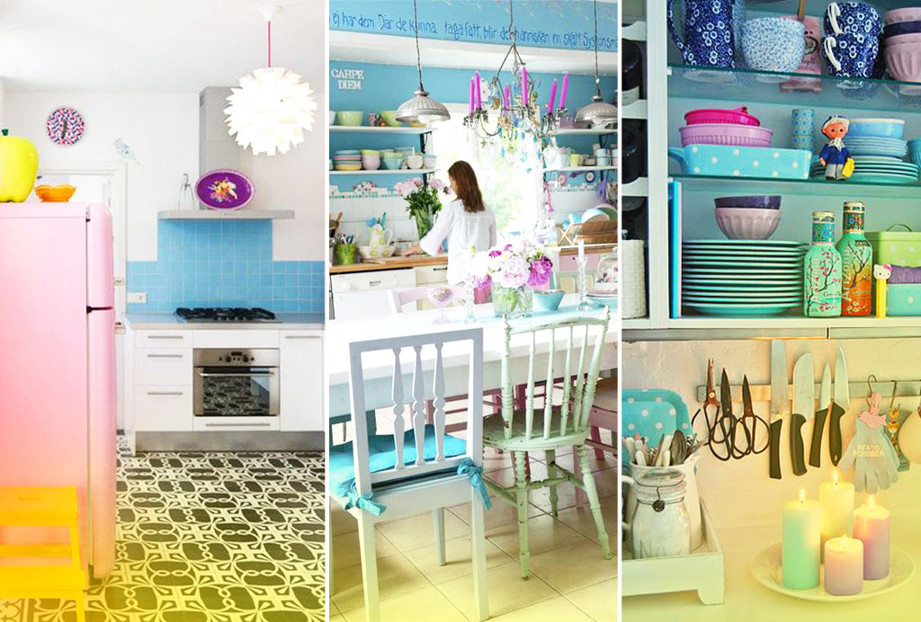 Presentes no mobiliário, acessórios, paredes e até na geladeira, as candy colors (cores de doces, como o rosa algodão doce e o verde menta) compõem uma decoração colorida, romântica e com um toque retrô nestas 38 cozinhas. Confira: