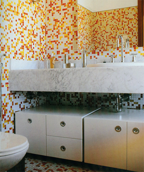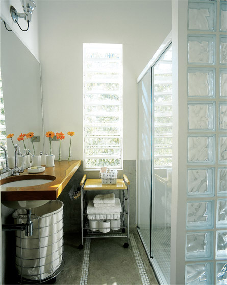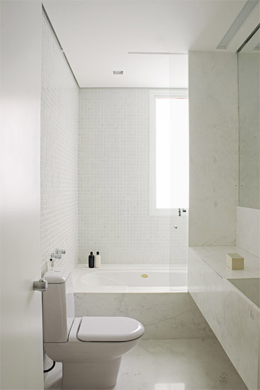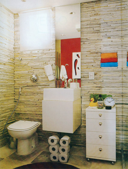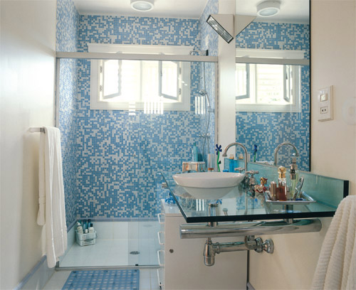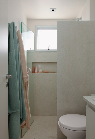 Desta forma, os revestimentos devem ser contínuos, como o cimento queimado ou grandes azulejos com rejuntes pequenos. Quanto menos emendas, mais o espaço parece amplo. As pastilhas pequenas, quando bem coladas também colaboram para estender o espaço.
