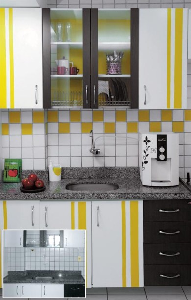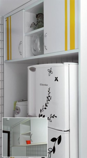 Sempre atenta a ideias econômicas de decoração – por isso, lê MINHA CASA e participa da Comunidade –, a fluminense Vânia Pinho encontrou um jeito prático de conferir um ar alegre à cozinha: o adesivo vinílico era a melhor opção para fugir da quebradeira no apartamento alugado há 11 meses, em Recife. Decidida a aplicar o revestimento apenas em alguns azulejos e no fundo do armário com portas envidraçadas, ao ver o resultado, Vânia resolveu ousar um pouco mais, criando listras nas superfícies de laminado. “Escolhi o amarelo porque queria um efeito solar”, conta a moça, que assumiu o artesanato como profissão graças ao incentivo do marido, o gerente de logística Aldafram Sales.