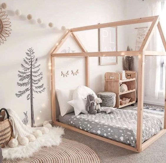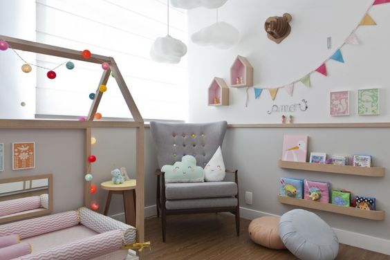 Para a filosofia Montessori, é importante que a criança conquiste a sua autonomia e seja capaz de interagir com os elementos do ambiente. Aqui, a cama deve ser baixinha e os brinquedos podem estar à disposição do bebê.