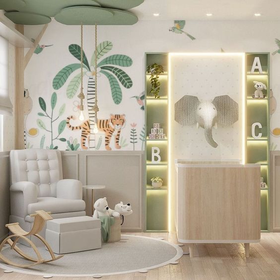 Caso opte por um quarto temático, busque não enchê-lo de referências, mas usá-las de forma pontual e com destaque. Por exemplo, se o tema for safári, que tal usar uma base neutra com destaques em verde e itens decorativos (brinquedos, bonecos, almofadas, móbiles) que façam referência aos animais? Assim, evitamos que a decoração fique muito cheia e caótica.