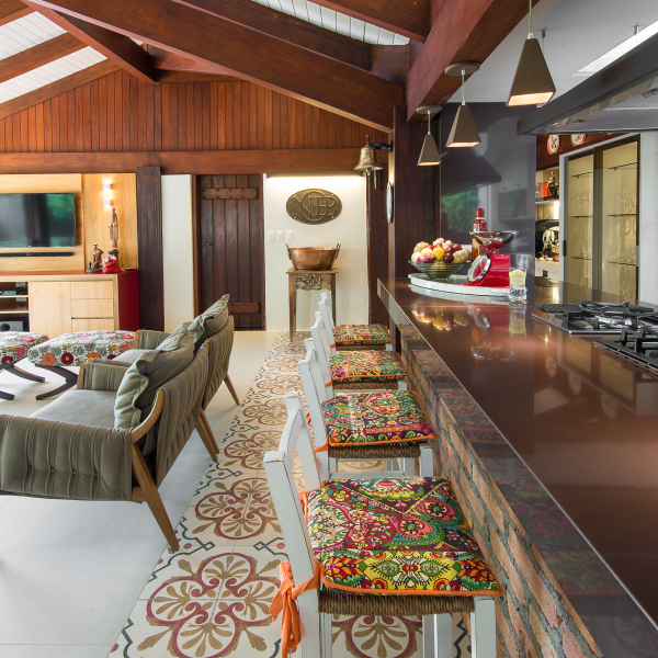 Projeto assinado por Camila Tannous aposta em tecidos coloridos, um chão que parece um tapete estampado e cozinha amplamente equipada