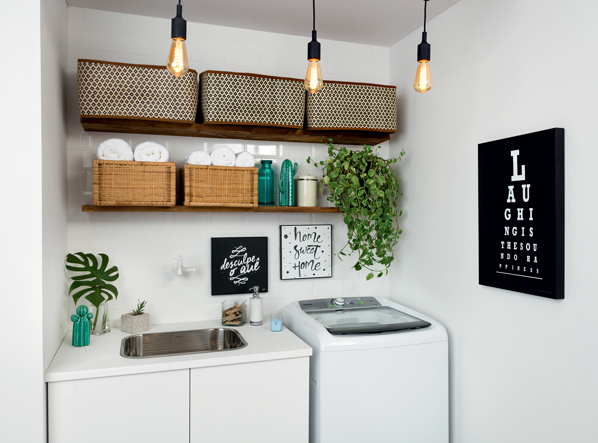 A bancada feita sob medida guarda um espaço perfeito para encaixar a nova lavadora Consul 13 kg, que economiza até 40% de água e sabão em pó* — até 600 reais por ano**. A luminária, feita com cano de PVC pintado de preto e pendentes simples, é um encanto à parte, bem pensada para quem quer dar vida ao espaço sem precisar fazer grandes mudanças de estrutura.