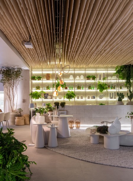 Mesas decoradas com desenhos sinuosos em tamanhos diferentes recebem as pessoas de forma tradicional. A arquiteta também trouxe a natureza para o ambiente, cercado por árvores naturais com 4 m de altura e uma iluminação suave que nos remete à luz solar.