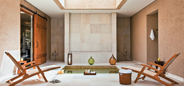 No projeto desta casa paulistana, os cuidados com o corpo foram valorizados. Ao lado da sala de ginástica, este ambiente com hidromassagem aguarda os moradores para uma seção de relaxamento. Revestido de pedra são tomé, cuja textura opaca transmite a sensação de aconchego, o anexo de 60 m² aposta em cores neutras e luz natural, que chega através da claraboia. Ela faz parte da estrutura do telhado e repete a medida do spa (2,60 x 2,60 m). Fica exatamente acima dele, criando um elegante efeito de iluminação. Internamente, o tanque recebeu mosaico de vidro mesclado em tons de verde e marrom (Vidrotil). Dois bancos submersos construídos a meia altura dos 90 cm de profundidade possibilitam o bom aproveitamento dos jatos de hidromassagem. Nesta ideia do arquiteto João armentano, os donos contam ainda com uma sauna e uma sala de banho, contíguas a este ambiente.