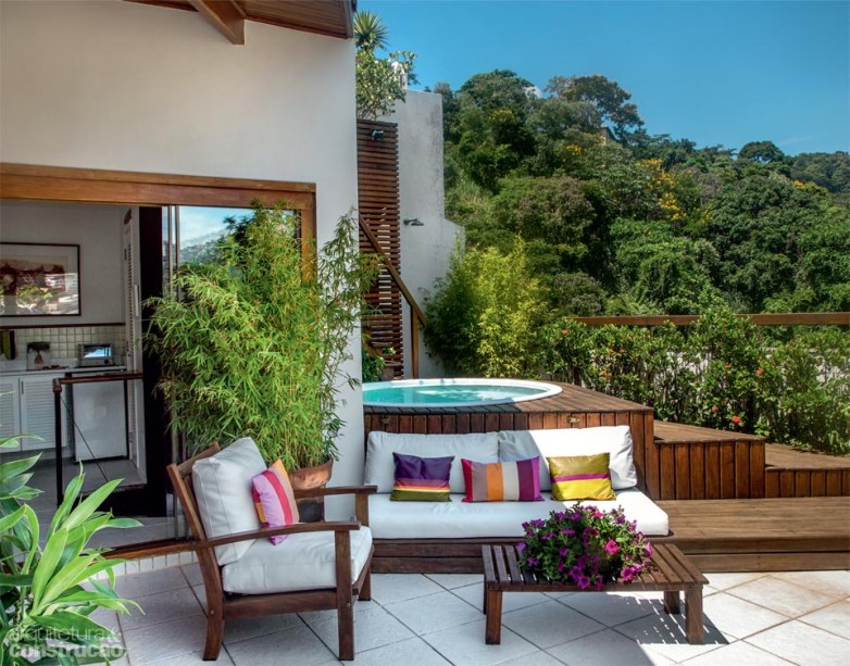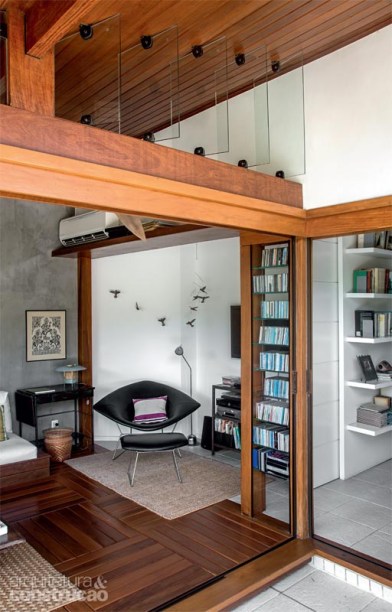 “Eu e meu marido compramos este apartamento de olho no belo terraço de cobertura de 64 m², cercado por plantas e com uma vista incrível do Rio de Janeiro. Na época, investimos apenas numa copinha, no banheiro e na piscina. Quando a legislação permitiu ampliar a área construída, decidimos criar a generosa varanda envidraçada, de 30 m², com vocação para quarto de hóspedes e sala de TV. Pedimos às arquitetas Andréia Vidigal e Flavia Lontra uma estrutura de madeira simples, de montagem rápida, que pudesse ser erguida sem danos ao piso de cerâmica preexistente. Além disso, o projeto deveria driblar a insolação da tarde e o vento intenso e não tapar o ralo de água da chuva instalado na área. A saída foi planejar um beiral largo o suficiente para proteger o ambiente do excesso de sol e adotar como assoalho placas de deque elevadas 10 cm e removíveis. O espaço tornou-se meu paraíso particular.”