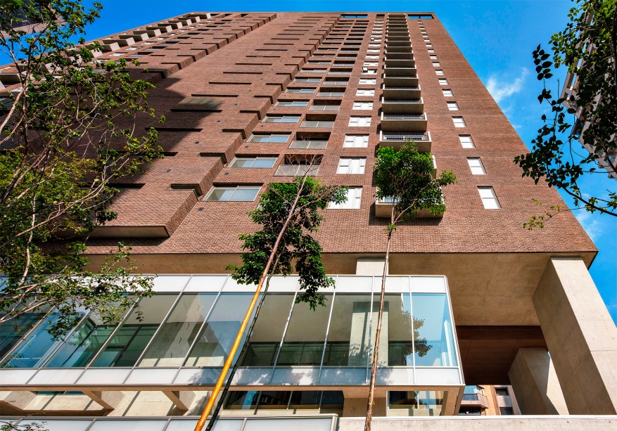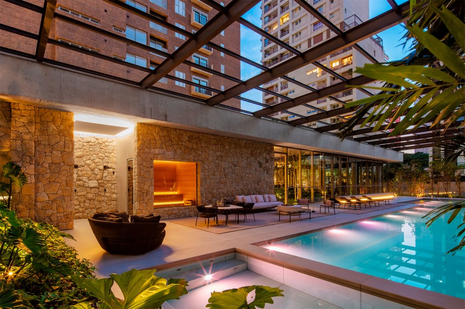 Outros destaques do projeto são os sistemas de água de reuso e placas solares para aquecimento da piscina e da água utilizada no interior das unidades. Na fachada norte, o tijolo escuro, de estilo londrino, conversa harmoniosamente com outros materiais, além de possuir um desempenho termoacústico.