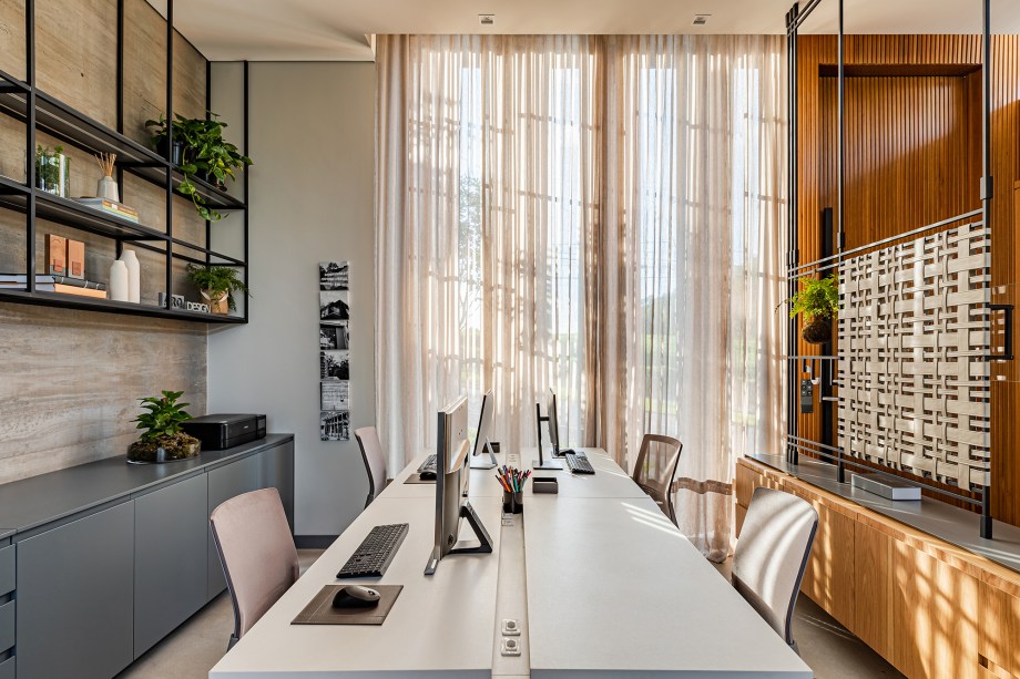 Os armários da copa possuem portas que, quando fechadas, se camuflam na marcenaria do escritório. Estruturas metálicas criam prateleiras em vários pontos e expõem peças de decoração e materiais de trabalho. O pé-direito alto aumenta a sensação de amplitude.