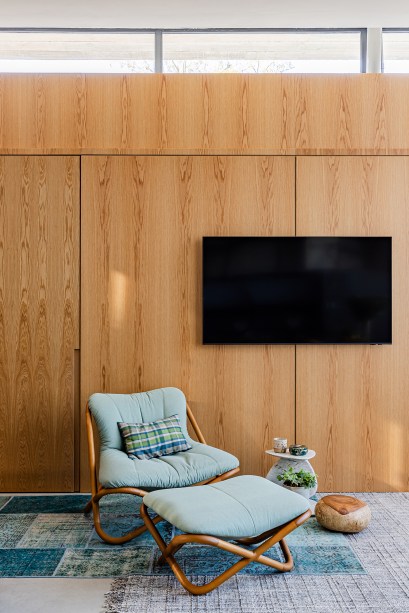 No segundo volume, mais intimista, concentram-se uma sala de atendimento rápido, espaço de reuniões e um lavabo. A divisão dos programas se dá por um painel revestido com lâmina natural de madeira e portas na mesma linguagem.