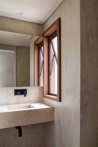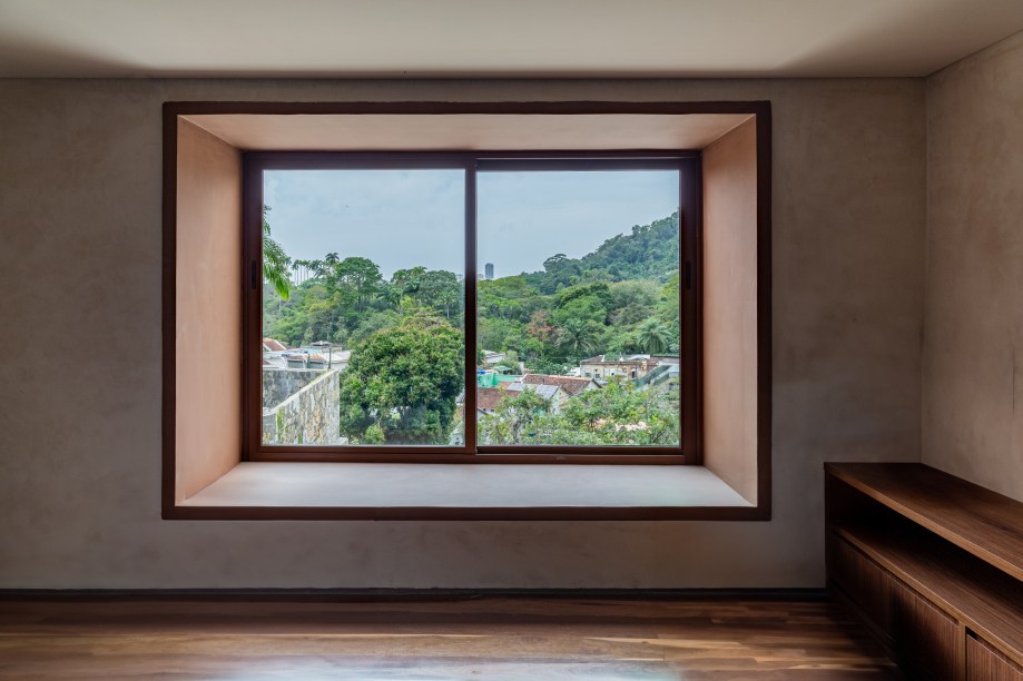 O uso do muxarabi original, presente nas venezianas da antiga construção, nas novas fenestrações remete à memória, além de filtrar a entrada de luz na fachada frontal, voltada para o norte. A mesma sensibilidade ocorre no desenho do guarda-corpo do terraço superior, pensado a partir do guarda-corpo de madeira que existia na varanda voltada para a rua da antiga edificação, com o acréscimo de jardineiras suspensas que trazem o verde para a residência.