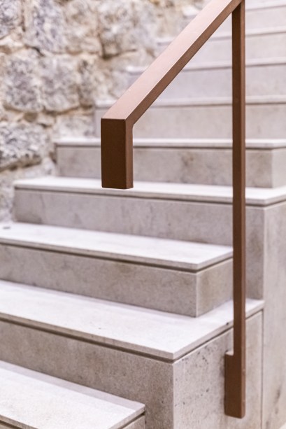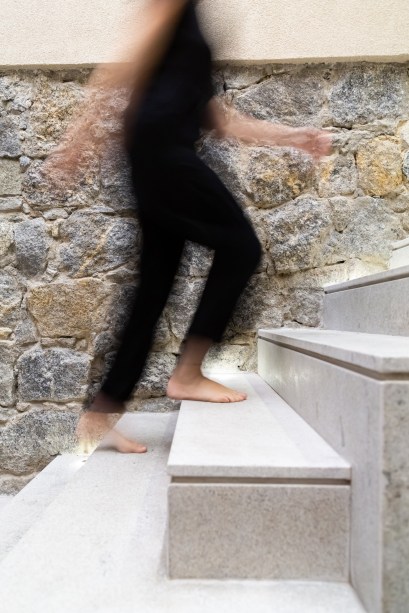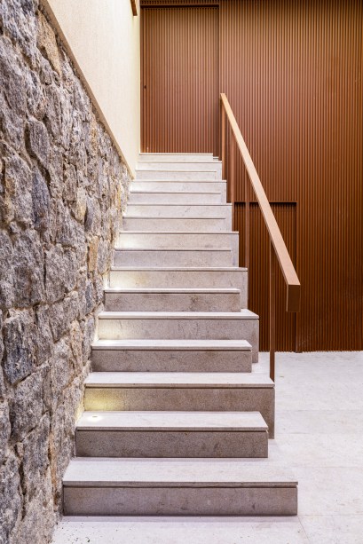 O desenho de um pátio coberto, com iluminação zenital, introduz a escada de acesso junto ao antigo “muro” de pedra, enraizando a casa em seu lugar de memória, além de criar um grande momento de recepção.