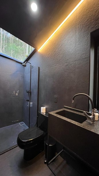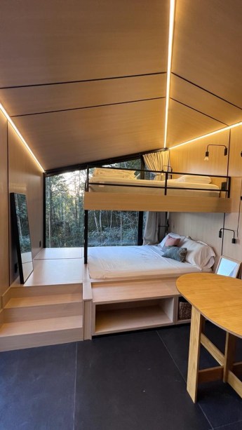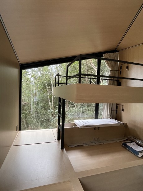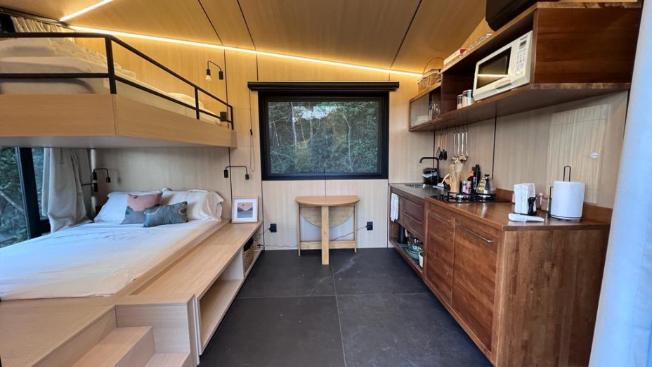 A casa na árvore ainda conta com uma inovadora beliche queen size, acomodando até 2 adultos e 2 crianças, com uma grande janela para a mata. Apesar da casa não ser flutuante, a grande janela ao lado das camas proporciona o relaxamento dos hóspedes com vista para a mata e a represa e provoca a sensação de estar flutuando. Além disso, a hospedagem possui uma abertura zenital no banheiro, que permite um banho com vista para o céu e a copa das árvores.