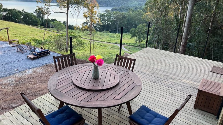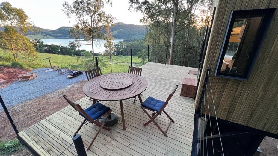 A casa é elevada a quase 4 metros do solo, na altura das árvores, dentro da fazenda Pedra Alta e com vista e acesso à represa de Joanópolis. “O propósito se conecta com o imaginário e sonho de criança da casa na árvore. O destino une montanha com sensação de litoral. Além disso, o hóspede tem uma área de lazer própria com sofá, mesa externa, chuveirão e churrasqueira”, comenta Pedro Lira, arquiteto e sócio do Altar e Natureza Urbana.