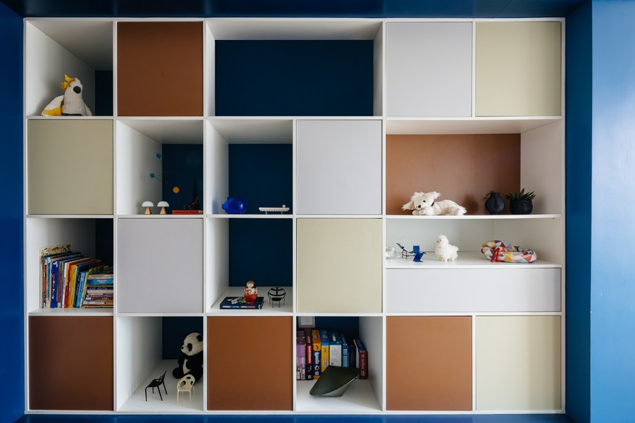 A terceira caixa é o mezanino, que abriga o escritório e a quarta caixa é a estante da brinquedoteca.