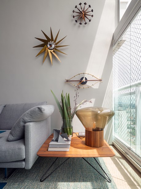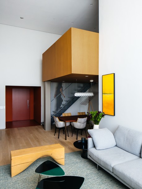 O grande diferencial do projeto e destaque foi a forma como a arquitetura compõe e setoriza os ambiente. Quatro caixas programáticas e cromáticas criam cenas dentro do apê, que é beneficiado por um generoso pé-direito duplo.