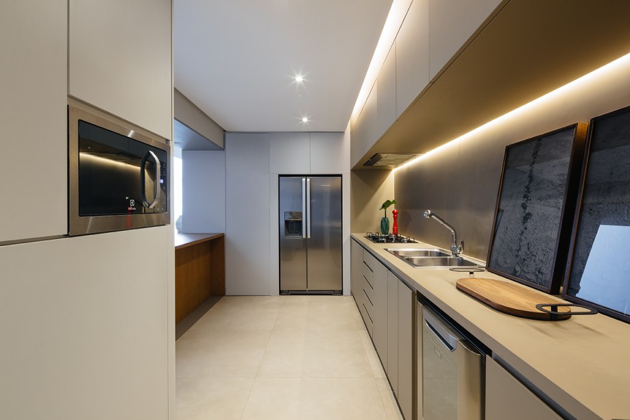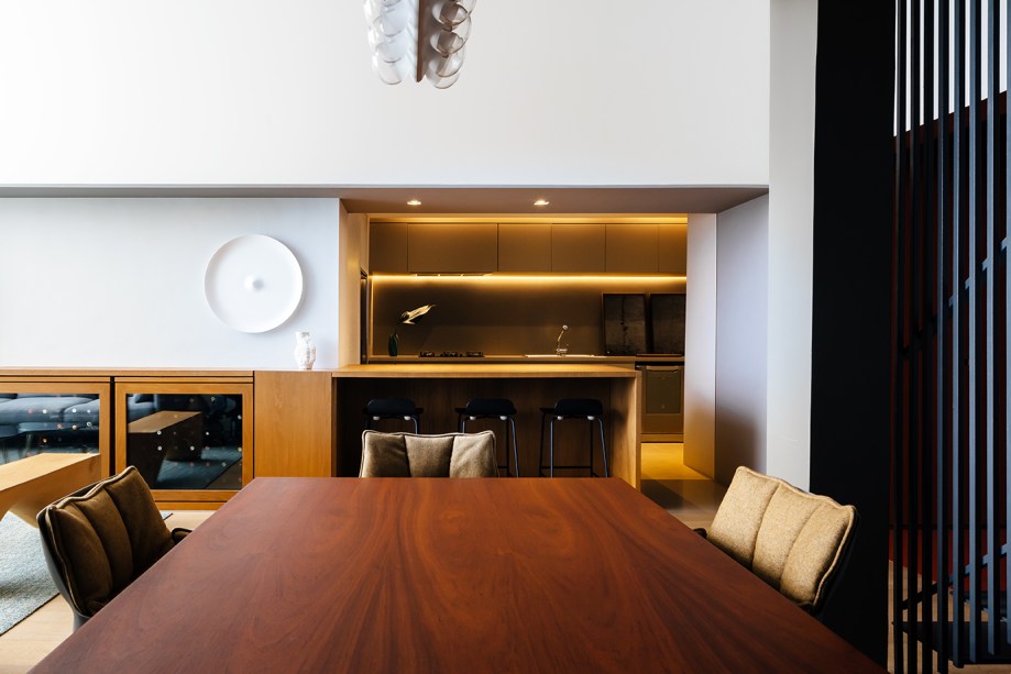 A segunda caixa é composta pela mesa que divide a cozinha e sala de estar, e um grande móvel que recebeu a tensoflex como artificio luminotécnico simulando o nascer e pôr do sol, através da dimerização dos leds. “Através dessa luz cálida e mutável, conseguimos mudar o caráter do espaço integrado e único desse apartamento”.