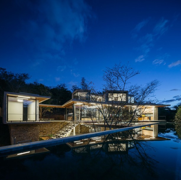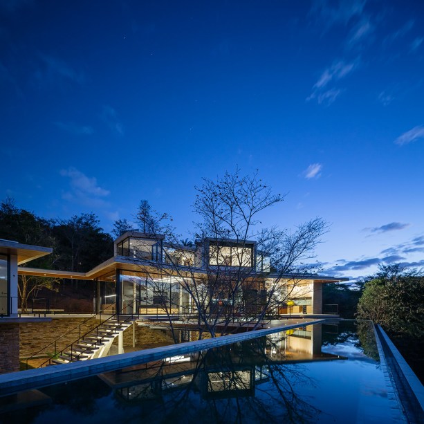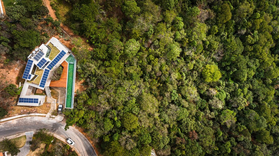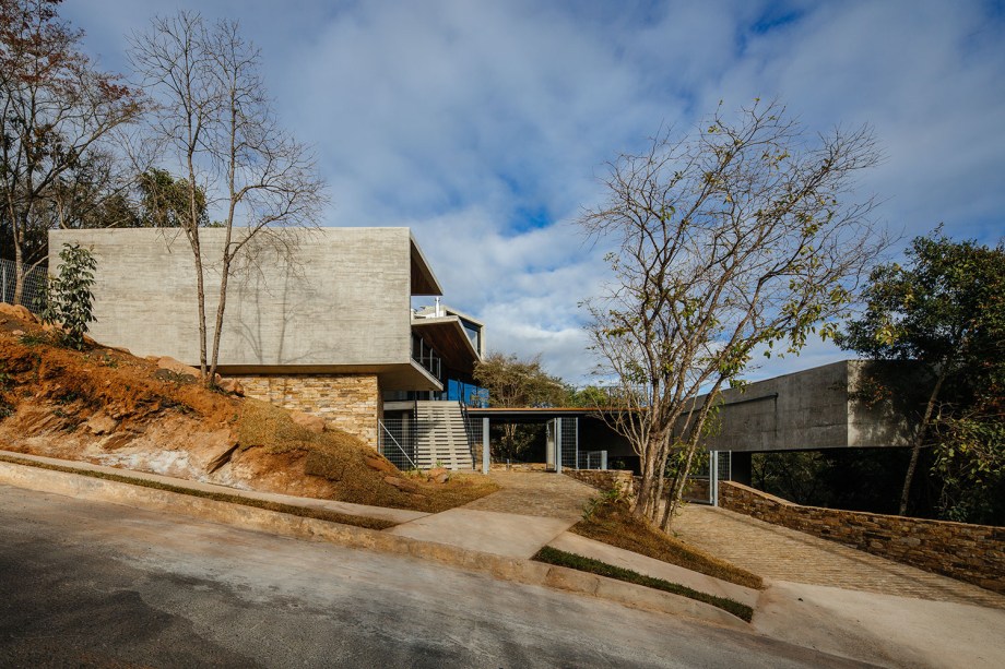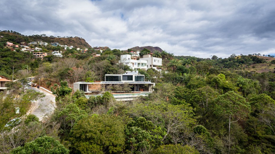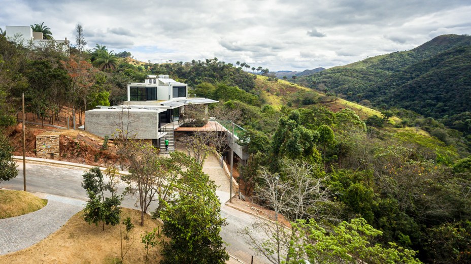 Um terreno com declividade acentuada pode parecer um fator de desafio, mas para esse projeto, no Morro do Elefante, em Nova Lima (MG), foi um elemento de solução e implantação da morada.