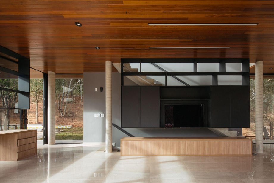 Pilares e lajes nervuradas representam o sistema construtivo. O uso do concreto aparente nas empenas da casa, piscina e lajes, trazem a atemporalidade desejada para o projeto.