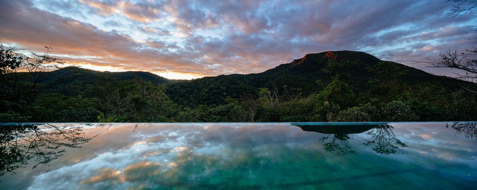 A pedido do cliente, uma raia de 25 m é parte fundamental da composição volumétrica desta residência. Sustentada por dois pilares de concreto, elevam a borda da piscina 6 m do solo natural, proporcionando para quem está de dentro da piscina, o contato visual com a copa das árvores e com o Morro do Elefante mais adiante.