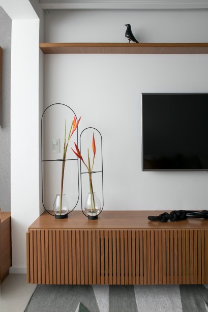 Cozinha, sala e varanda foram integrados para garantir maior fluidez entre os ambientes. Na sala, uma peça de marcenaria é multiuso e ajuda a economizar espaço — funciona como rack, baú e banco para a mesa de jantar. Um tapete estampado com toques de verde rouba a cena e traz um toque de cor ao décor neutro.