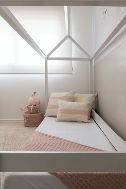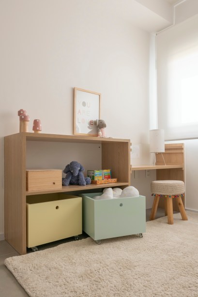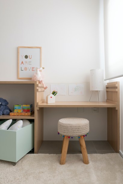 Para os quartos de casal, os arquitetos desenharam um armário com nicho embutido que serve de mesa lateral de um lado da cama. E do outro, um móvel par servir de home office. No quarto de Laurinha, um mapa-mundi estampa o papel de parede e móveis baixos garante mais autonomia para a pequena.