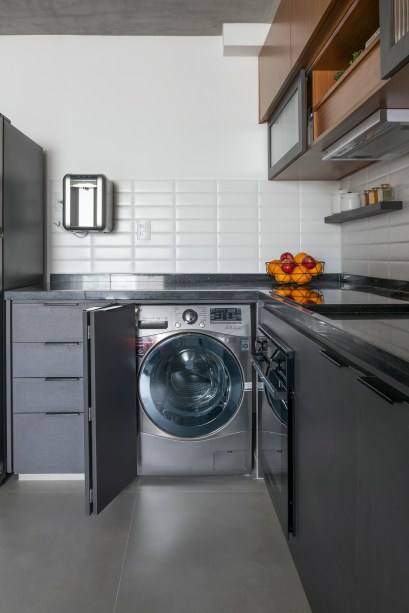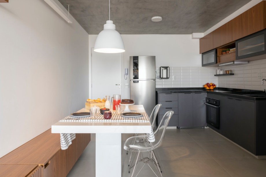 Os revestimentos seguem a proposta de praticidade. No piso, um porcelanato com textura cinza e no teto, uma textura de cimento queimado. Para completar a atmosfera aconchegante, foi feito um projeto de iluminação pontual: os arquitetos desenharam um perfil linear de serralheria para refletir a luz no teto e criar pontos de luminosidade indireta, ideal para a noite.