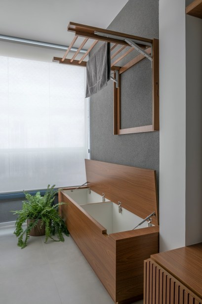 Na varanda, mais um truque para aproveitar bem cada centímetro. O banco baú continua junto com uma marcenaria que foi desenhada pelos arquitetos para esconder a máquina do ar-condicionado, servindo também para plantar a horta do casal e o barzinho.