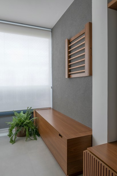 Para adequar os espaços, os arquitetos fizeram poucas intervenções estruturais no apartamento. Apesar disso, criaram soluções para refletir os desejos dos moradores. Entre elas, uma paleta neutra, com bastante madeira, cimento queimado e cinza chumbo.