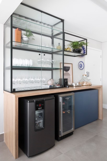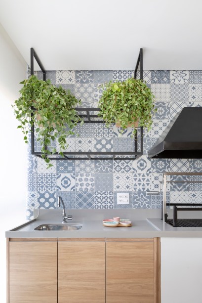 Repare que na área da churrasqueira, a parede foi toda revestida com ladrilhos hidráulicos em tons de cinza, puxando para um azul clarinho. Tons de azul, aliás, que aparecem também na marcenaria em outros ambientes e foram escolhidos por remeterem à memória afetiva da moradora. Ela queria que alguns elementos lembrassem Portugal, uma terra querida. Os pratos de cerâmica que trouxe do país ganharam, então, lugar de destaque na parede onde foi instalada a adega, com prateleiras de serralheria.