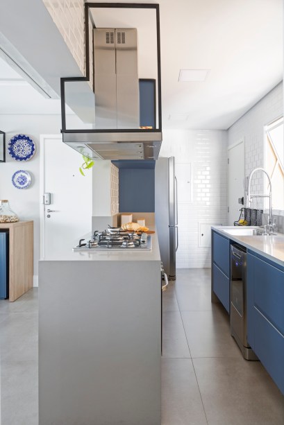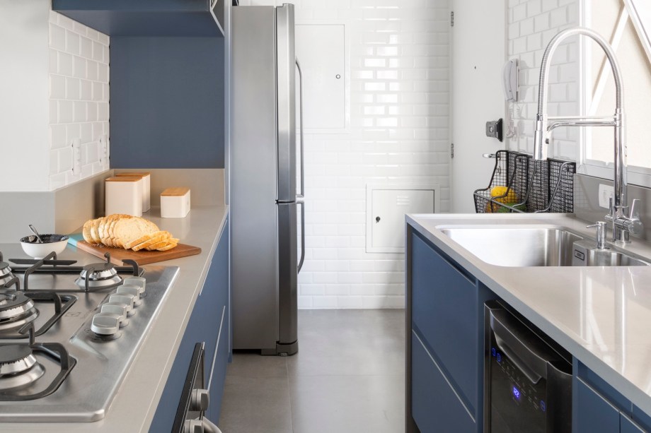 A cozinha americana, aberta para a sala de estar, foi toda revestida com subway tiles brancos e ganhou certo ar industrial com a bancada cinza e prateleira suspensa de serralheria que apoia a coifa de inox. A marcenaria azul se destaca entre os elementos de tons neutros.