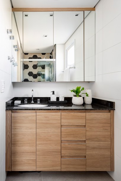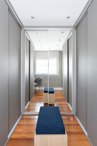 Um terceiro quarto do apartamento foi anexado à suíte master para se tornar o closet do casal. Além disso, as arquitetas desenharam uma penteadeira com espelho embutido no tampo, onde a moradora pode se maquiar e também usar o móvel como home office. Nos armários, alguns espaços foram criados especialmente para que joias e bijuterias pudessem ser armazenadas de forma organizada.