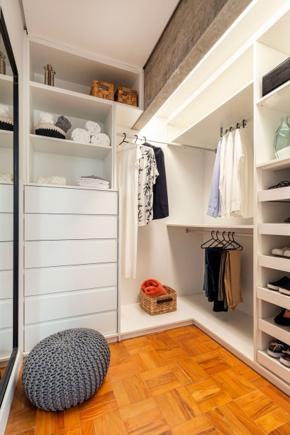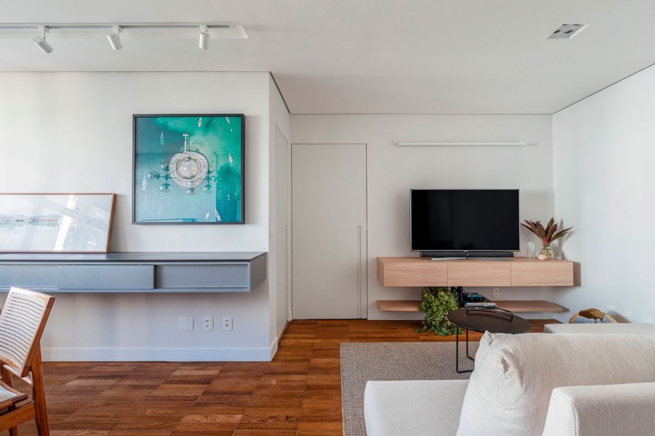 Neste apartamento foram reaproveitados alguns objetos e materiais importantes, como o piso em taco de madeira e o uso favorável dos elementos estruturais, que foram trazidos a mostra.