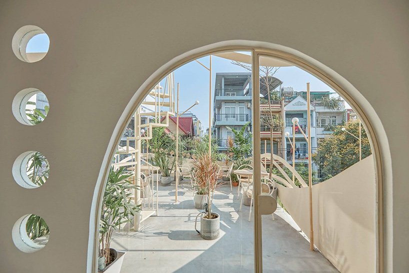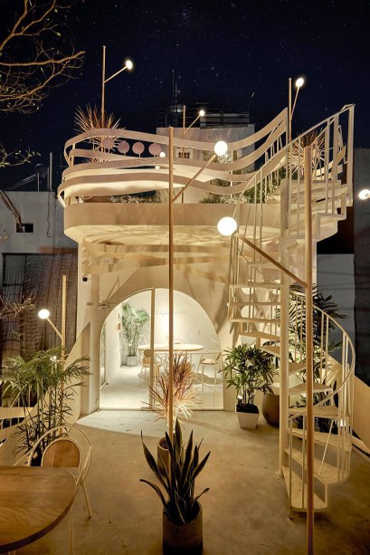 Cores neutras e suaves – como branco, bege e rosa-laranja – cobrem as paredes, móveis e o teto. Produzindo um sentimento que lembra uma brisa se espalhando pelos cantos do café, o Red5studio construiu o interior com arcos, aberturas redondas e escadas circulares.