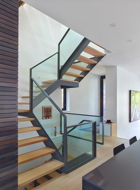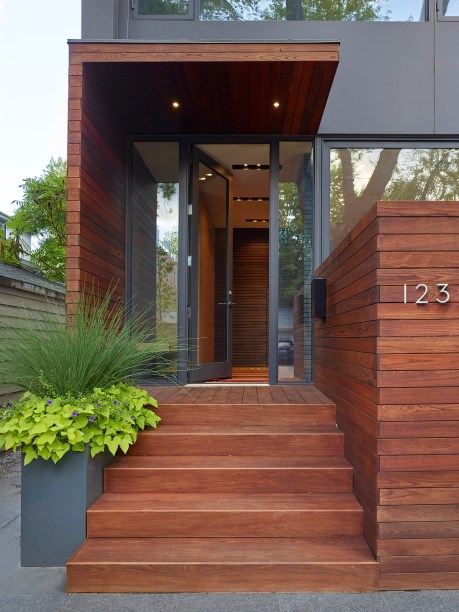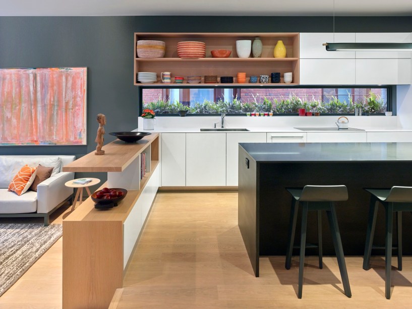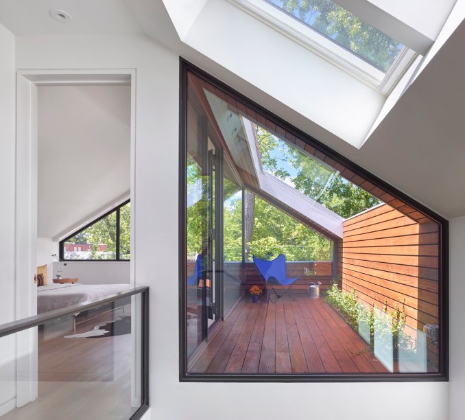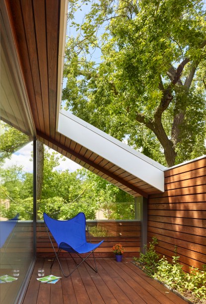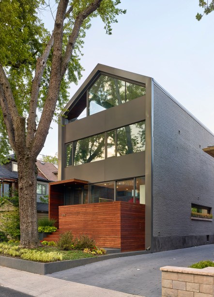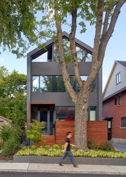 Os proprietários desta casa costumavam passar os fins de semana em uma casa no campo, perto de um riacho e cercada por árvores. “Nossos clientes queriam emular essa experiência bucólica em sua casa urbana. Eles expressaram um forte desejo por uma casa sustentável conectada ao seu ambiente natural ”, diz o diretor Heather Dubbeldam.