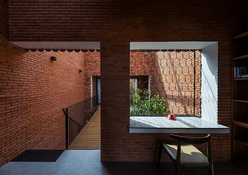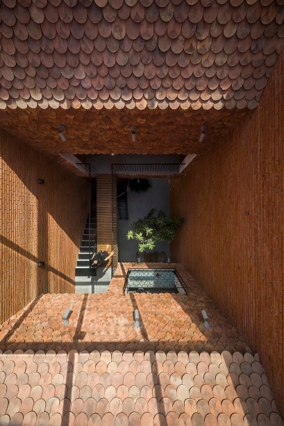 Em termos de materiais, a casa foi construída principalmente com tijolos vermelhos comuns e ladrilhos de escama de peixe que foram reciclados da antiga casa da família. Estes dois materiais conferem ao edifício um aspecto distinto, ao mesmo tempo rústico e vibrante, enquanto os azulejos reutilizados evocam memórias do passado de onde viveram.