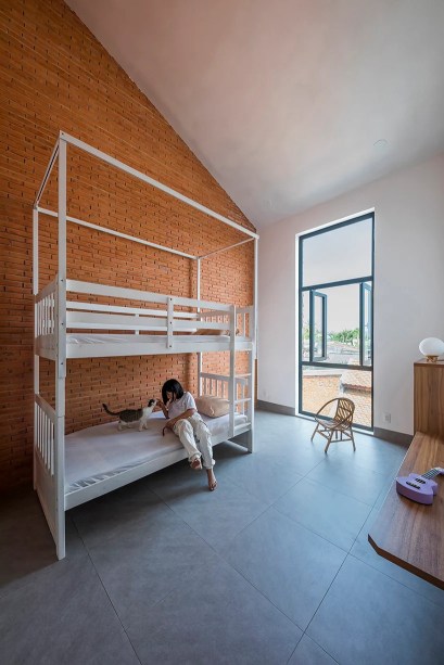 O espaço social central no primeiro andar é onde a família janta junta, as crianças estudam, o pai deita na rede e a mãe relaxa, lê ou cozinha. No piso superior, os beirais rebaixados criam um espaço de aprendizagem para as duas crianças, um local acolhedor e seguro mas ao mesmo tempo arejado e flexível.