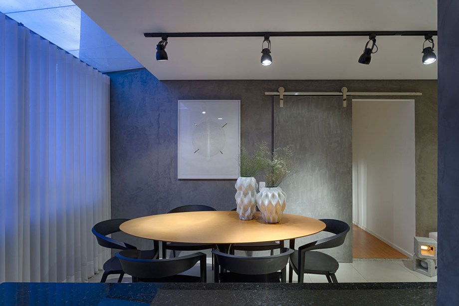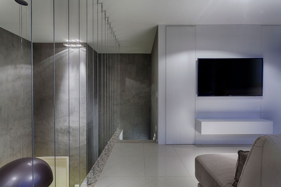 O destaque do projeto está no cimento queimado, usado, praticamente, em todo o apartamento. Ao lado dele, algumas paredes brancas, gesso no teto e iluminação cênica, para criar diferentes climas.