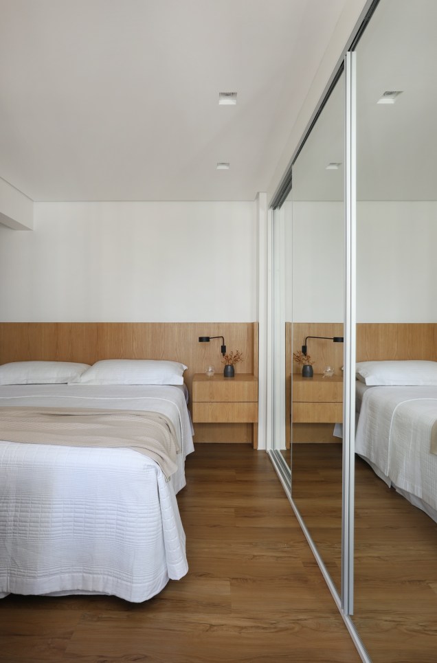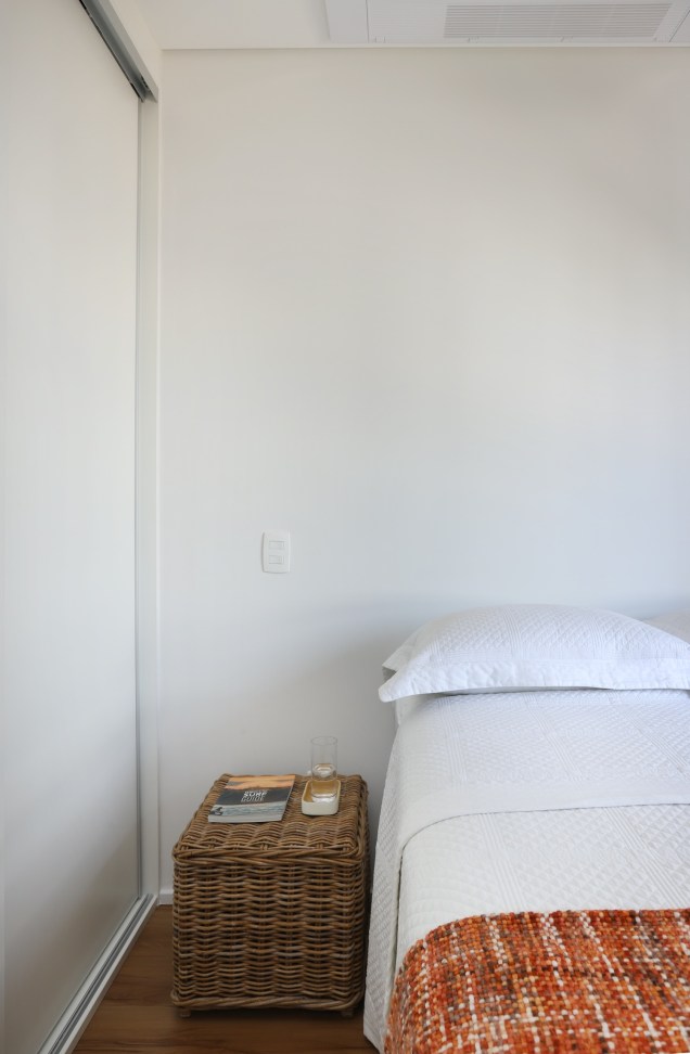 Durante a reforma, a principal mudança no apartamento ocorreu justamente na planta. O hall foi integrado à área social e isso permitiu a criação de um lavabo. E a separação entre varanda e living também desapareceu com o nivelamento do piso. Outra alteração estrutural importante aconteceu na área íntima. O banheiro da suíte master foi eliminado e, assim, o quarto foi ampliado. Dessa forma, o banheiro da suíte ao lado foi integrado a este espaço.
