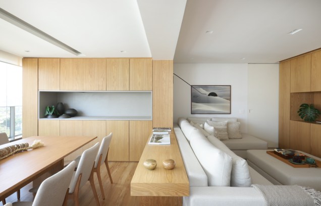 No hall, por exemplo, a porta do elevador ficou escondida. No living, o painel de marcenaria reveste o núcleo rígido do edifício com a porta de entrada, televisão e bar de apoio. Já na sala de jantar, que fica na varanda, a marcenaria inteligente transforma o ambiente. Para jantares formais, a churrasqueira e a cuba são tampadas e se camuflam ao nicho do armário. Em dias de churrasco, as tampas saem e a churrasqueira se encaixa.