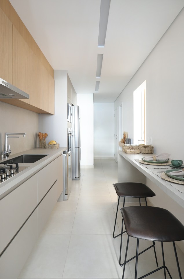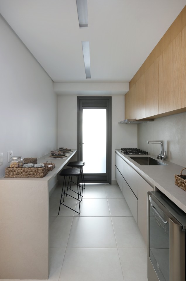 Além das cores sóbrias, as linhas retas marcam o estilo contemporâneo da arquitetura do projeto. A ideia era deixar os ambientes atemporais e sofisticados. Para isso, a marcenaria colaborou muito. Os painéis de madeira, muitas vezes, camuflaram algumas estruturas.