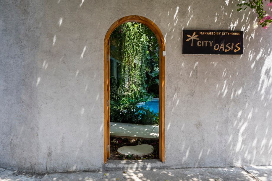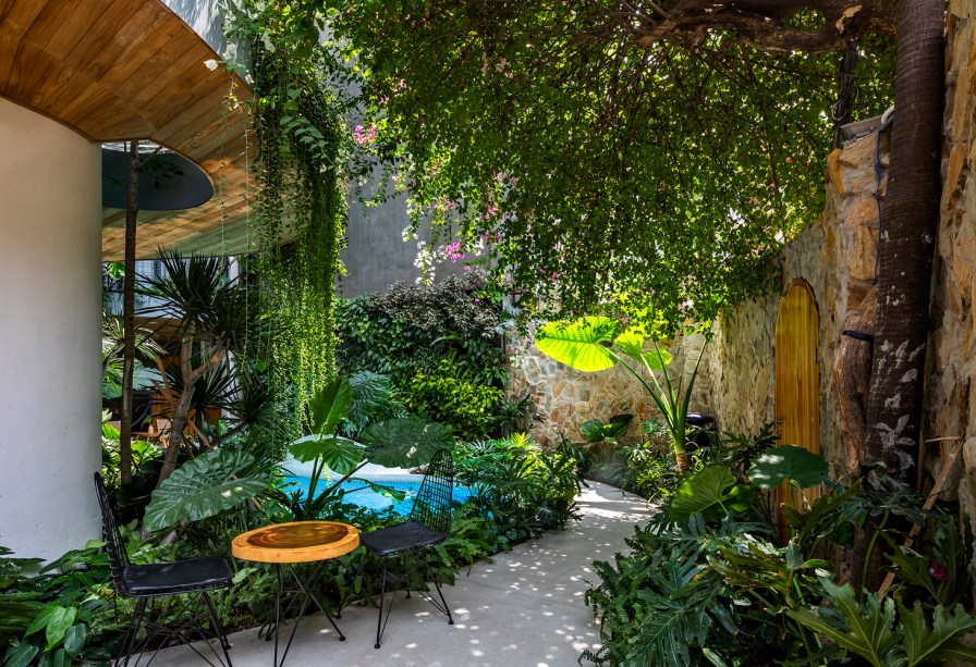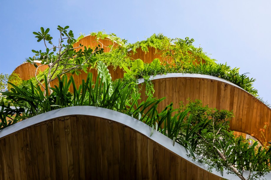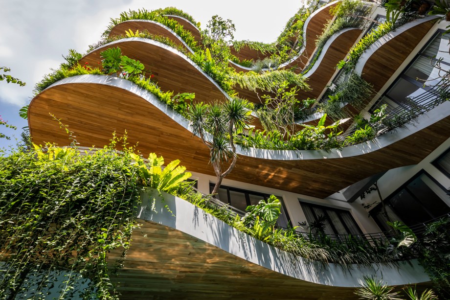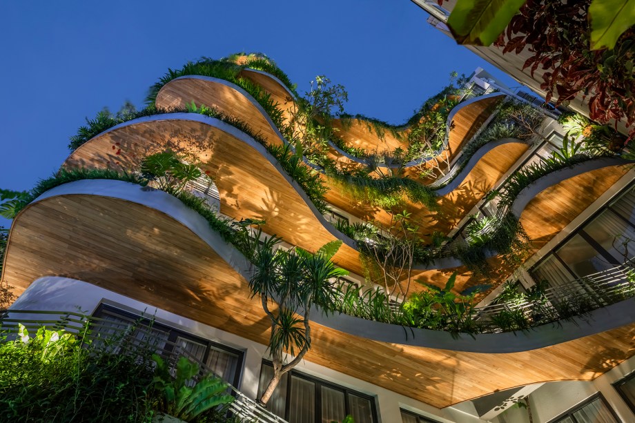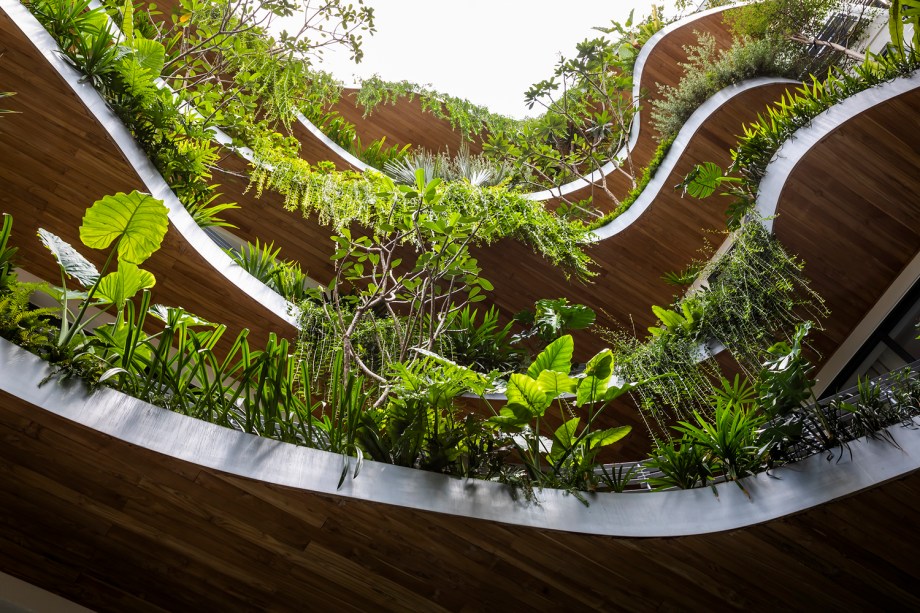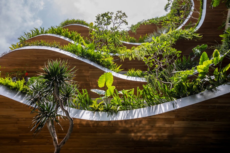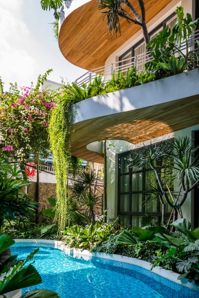 Exuberantes plantas tropicais caem das varandas onduladas desse edifício, criando uma fachada verde que oferece ar fresco e uma atmosfera relaxante. O grande vazio no terreno de 320 m² apresenta uma piscina curva onde os visitantes podem mergulhar em um ambiente tranquilo.