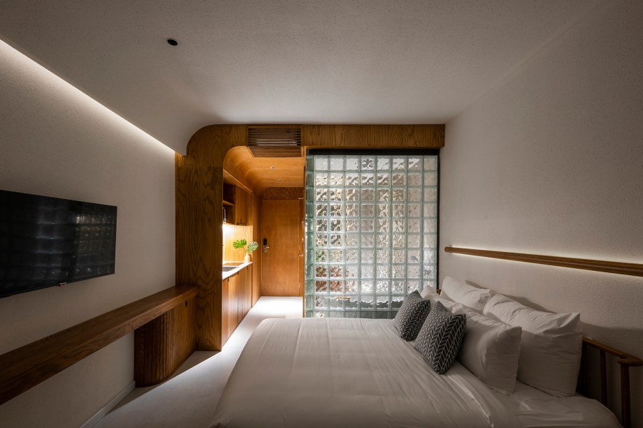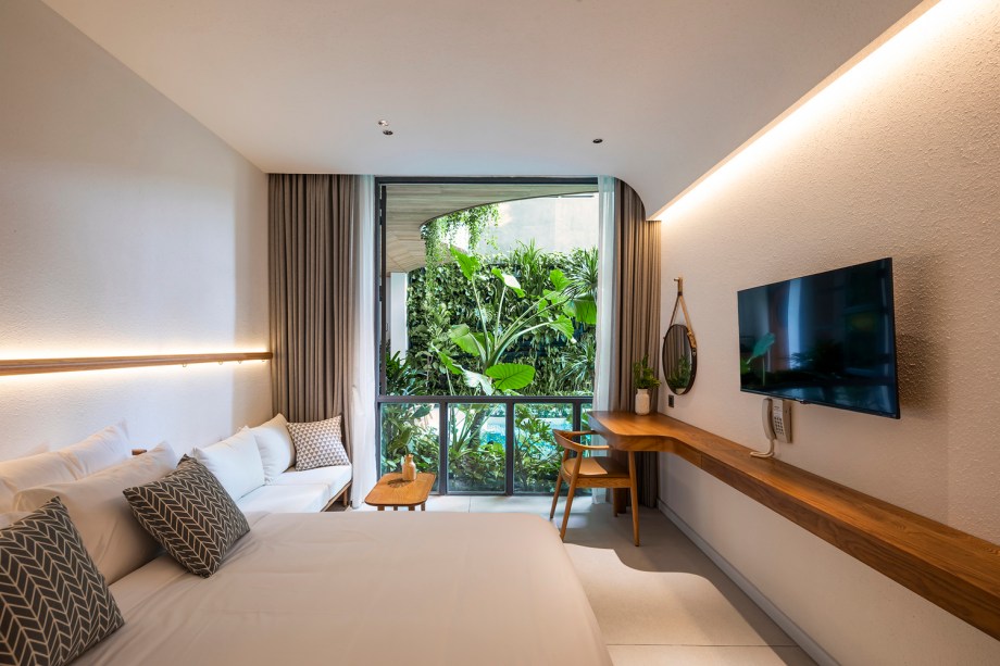 Um caminho curvo conduz os hóspedes através do exuberante pátio para o lobby, onde grandes paredes de cortina confundem os limites entre o interior e o exterior. No interior, o estúdio K.A revestiu os quartos com materiais tradicionais e ecológicos, como rattan, madeira e pedra local.