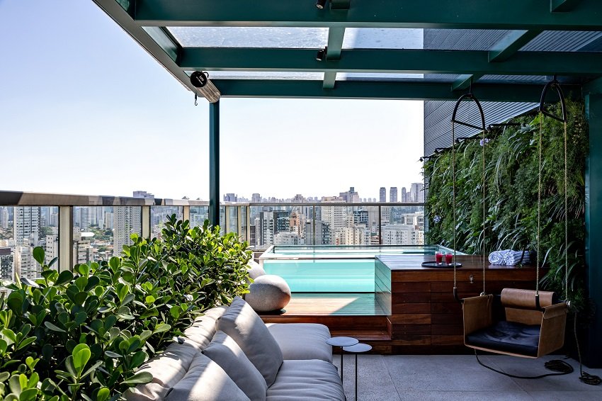 Do lado de fora, a paisagem foi projetada por Leticia Bonomi, com um enorme jardim vertical junto à piscina, enquanto móveis confortáveis complementam o espaço. A bancada externa em basalto brasileiro funciona como uma área de cocção com diversos eletrodomésticos, tornando a cobertura um espaço ideal para contemplar o horizonte da cidade. Veja mais fotos do projeto na galeria.