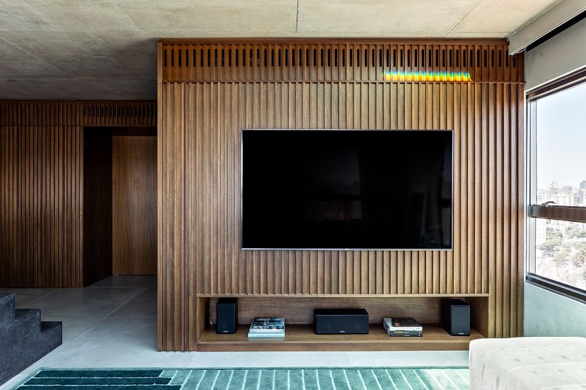 Enquanto isso, um painel rítmico de madeira tauari envolve a área do dormitório, dando unidade e organizando visualmente o espaço. As tiras de madeira contrastam com os pisos e lajes de cimento, dando aconchego ao acesso principal do apartamento. A suíte principal possui cabeceira de couro e poltrona de veludo verde – tons aconchegantes que trazem conforto ao ambiente todo de concreto.