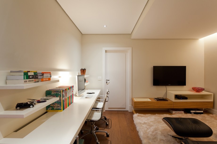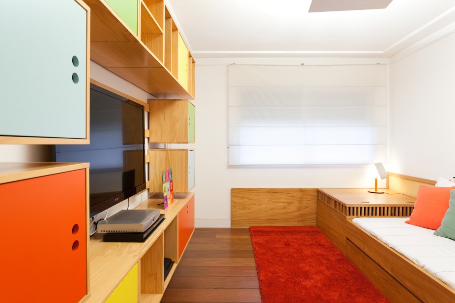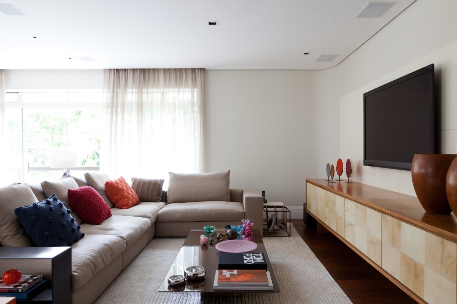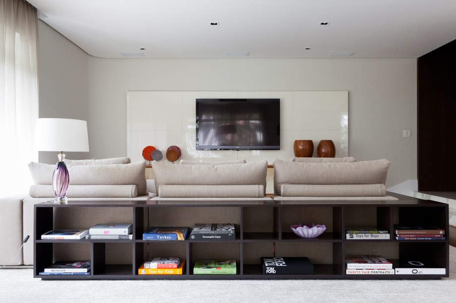Para a sala de TV, o aparador foi desenhado pela própria Patrícia: a peça de madeira Freijó ganhou algumas aplicações de pergaminho no móvel. Atendendo ao desejo do morador, a profissional também incluiu um sofá extremamente confortável no ambiente.