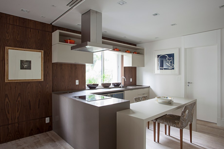 Bancada de lâmina sintetizada integra cozinha e área gourmet neste apartamento