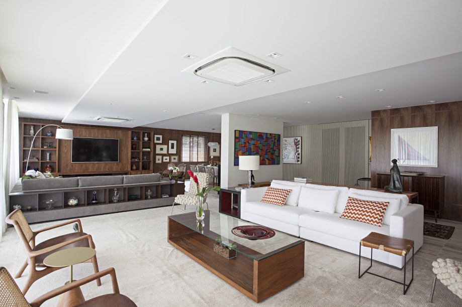 Outro desafio era a proporção da reforma, que teve parte hidráulica, elétrica, alvenaria, piso e forros completamente renovados. A iluminação foi um ponto de atenção para destacar as obras de artes dos proprietários e também trazer o acolhimento e bem-estar necessário para os ambientes. O pé-direito era muito baixo, exigindo atenção e soluções para instalar o sistema de ar-condicionado, então, o forro foi rebaixado em sua área central e uma sanca iluminada foi colocada neste espaço.