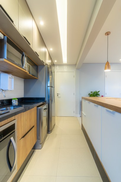 Na cozinha, armários com portas de vidro reflecta também contribuem para a amplitude. O balcão de refeições, armários e gaveteiros voltados para a cozinha otimizam o espaço.